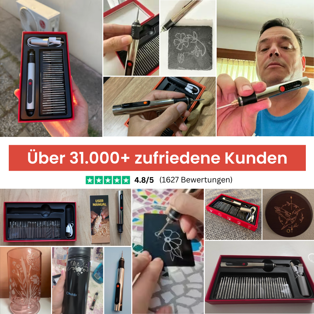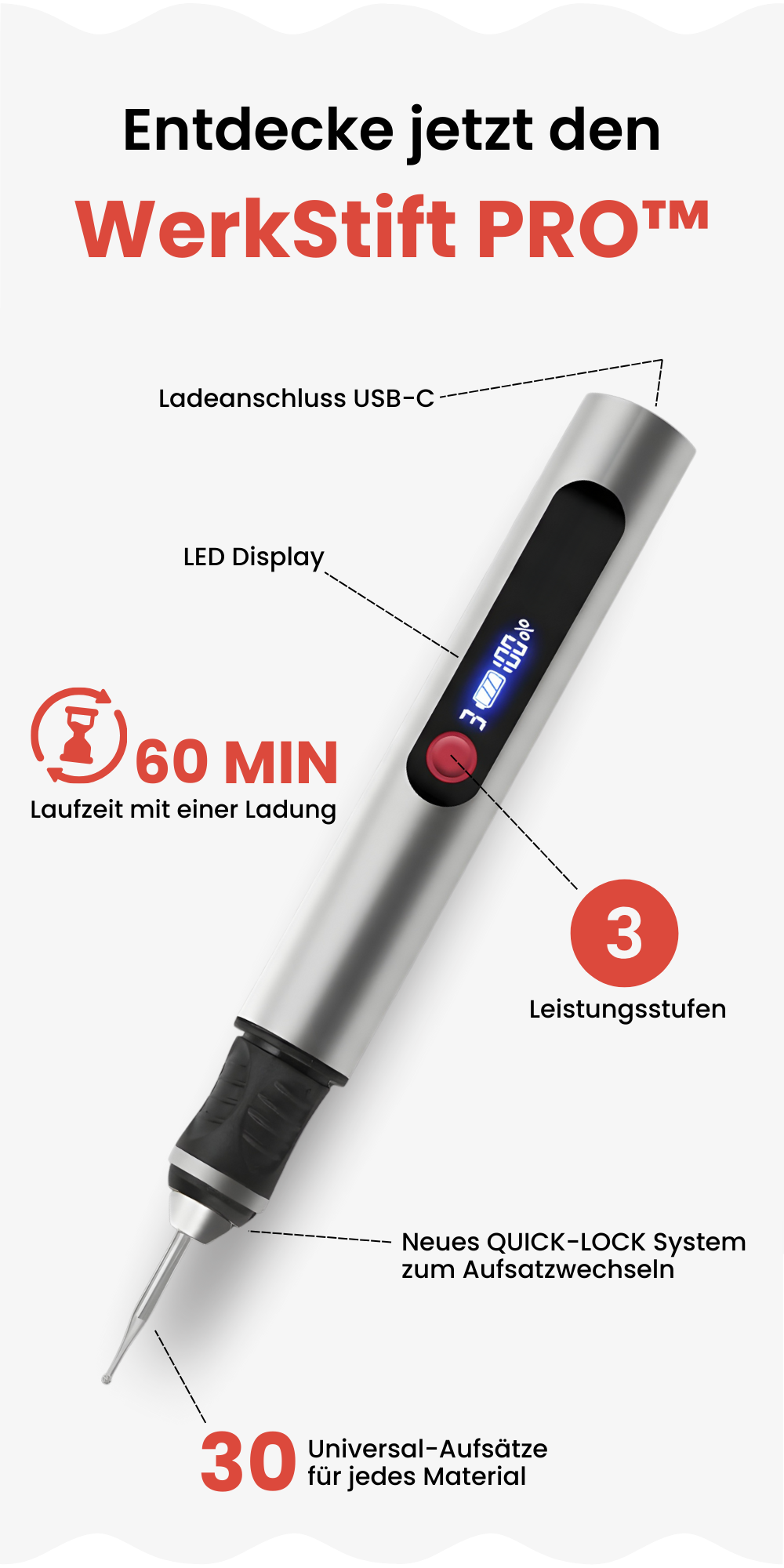 Ein leiser, vibrationsarmer Präzisions-Gravierstift, der dir beim Arbeiten Ruhe, Kontrolle und echte Freude zurückgibt – ganz ohne Vorkenntnisse.