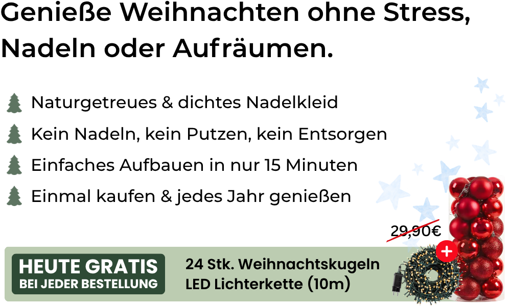 Zu jedem unserer Weihnachtsbäume erhältst du automatisch eine 20m lange LED-Lichterkette und 24 Stk. rote Weihnachtskugeln gratis dazu – kein Code, kein Extra-Schritt nötig!