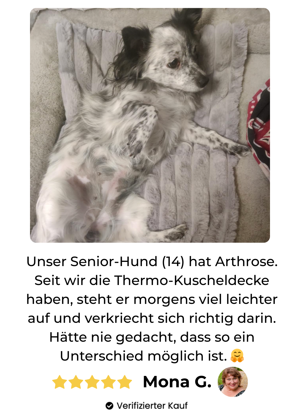 Gleichzeitig kann die sanfte, natürliche Wärme Senior-Tieren, Tieren mit Gelenkproblemen und sensiblen Vierbeinern spürbare Erleichterung bringen. Viele Tierärzte empfehlen deshalb warme, gut gepolsterte Liegeplätze – genau dafür wurde die Thermo-Kuscheldecke entwickelt.